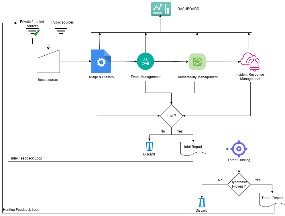 The above image is an example of how Threat Intelligence and Threat Hunting would fit into a cybersecurity operations process. The goal is to make sure that there is a strong feedback loop that flows back as a source into the pipeline.